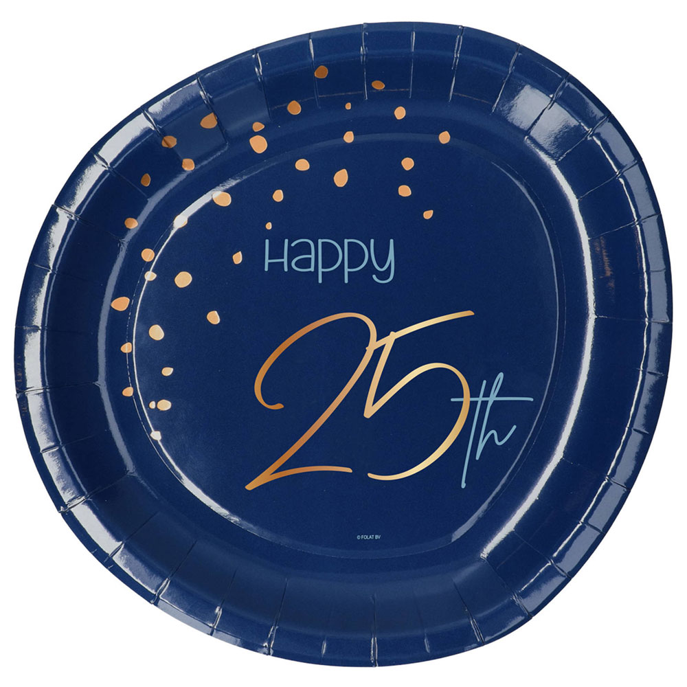 Bjud in din familj och vänner till 25-års fest och servera gästerna en smarrig födelsedagstårta eller kanske en bit god mat på dessa festliga Happy 25th engångstallrikar! Riktigt fina papperstallrikar i mörkblått och skimrande guld som garanterat livar upp firandet. De här tallrikarna kan även enkelt kan matchas med andra mörkblåa och guldiga dukningstillbehör för en komplett 25-års kalas- eller fest dukning.
