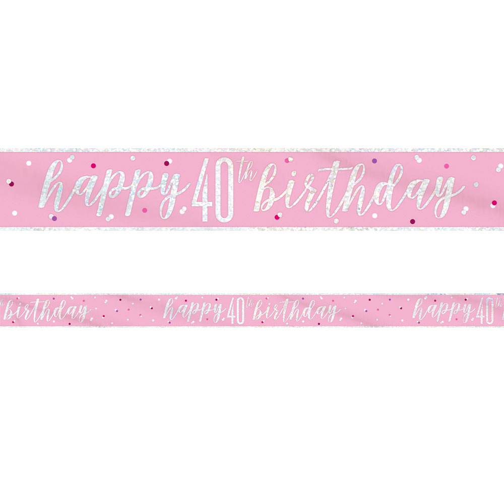 Happy 40th Birthday Banderoll Rosa & Silver omfattar en banderoll med vita, rosa och silvriga prickar på rosa bakgrund med "Happy 40th birthday" text och baksida i silver med holografisk effekt. Banderollen är ca 13 cm hög och 2,74 meter lång och är tillverkad i tunn plast.