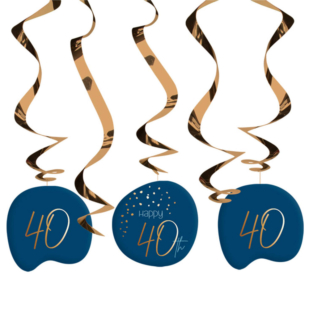 Förvandla ditt 40-års kalas till ett riktigt strålande firande med dessa festliga swirls! Med hjälp av dessa swirls kan du enkelt få till en riktigt effektfull hängande 40-års fest dekoration på ett snabbt och smidigt sätt. Super fina swirls för alla 40-åringar som önskar ett kalas i mörkblått och guld.