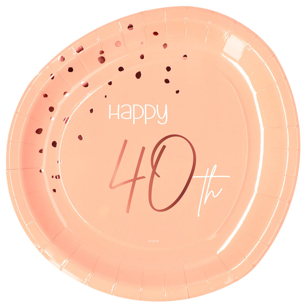 Happy 40th Tallrikar Ljusrosa omfattar ljusrosa engångstallrikar med roseguldiga prickar samt texten "Happy 40th" i vitt och roséguld.
