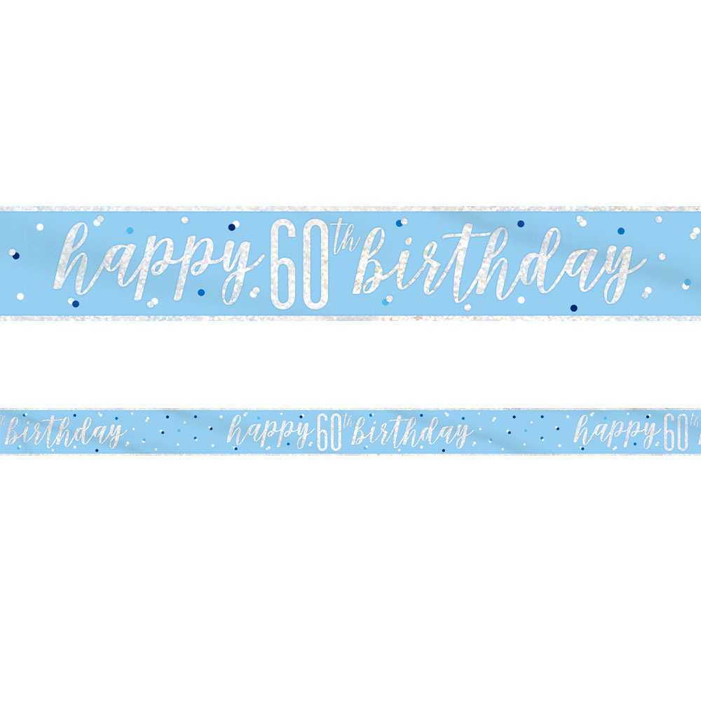 Happy 60th Birthday Banderoll Blå & Silver omfattar en banderoll i ljusblått med prickar i vitt, silver och blått och holografiskt silvrig baksida och texten "Happy 60th birthday". Banderollen är ca 2,74 meter lång och 13 cm hög. Tillverkad i tunn plast.