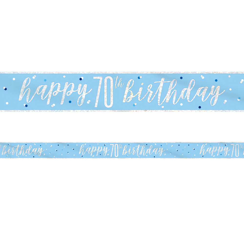 Happy 70th Birthday Banderoll Blå & Silver omfattar en ljusblå banderoll med "Happy 70th birthday" text och baksida i holografiskt silver. Banderollen har prickigt motiv i blått, silver och vitt och är tillverkad i tunn plast. Banderollen är ca 13 cm hög och 2,74 meter lång.