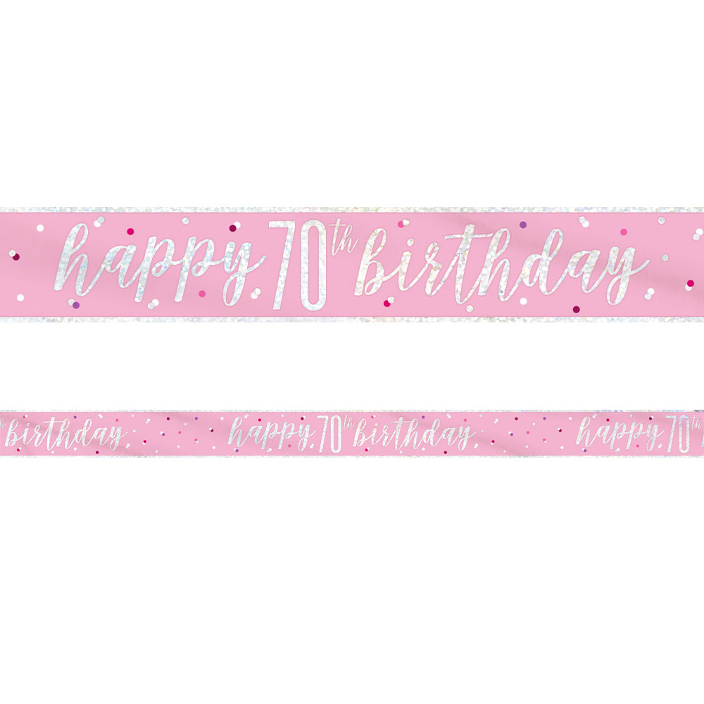 Happy 70th Birthday Banderoll Rosa & Silver omfattar en rosa banderoll med silvrig holografisk "Happy 70th birthday" text och baksida samt motiv av prickar i vitt, silver och rosa. Banderollen är ca 13 cm hög, 2,74 meter lång och är tillverkad i tunn plast.