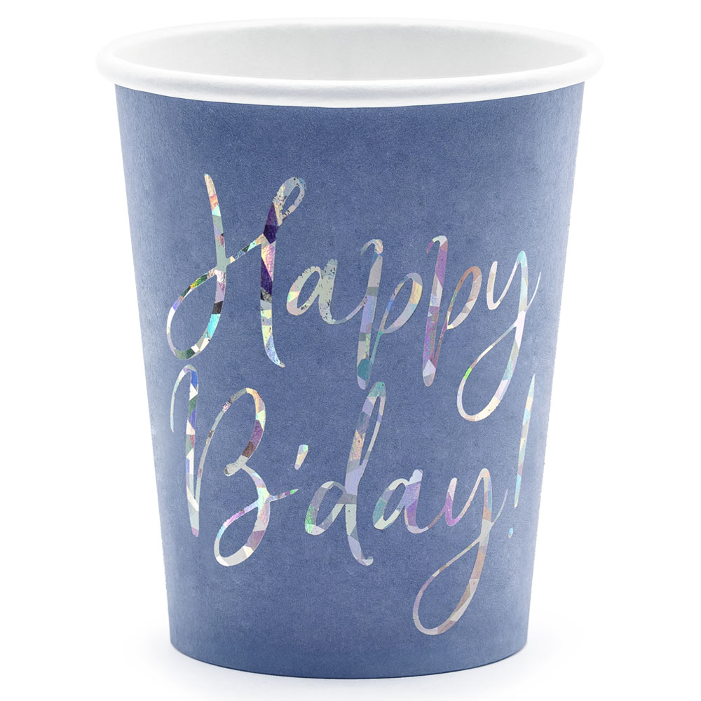 Happy B'day Muggar Grålila innehåller engångsmuggar i en grålila nyans med dekorativ "Happy B'day!" text i regnbågsskimmer.