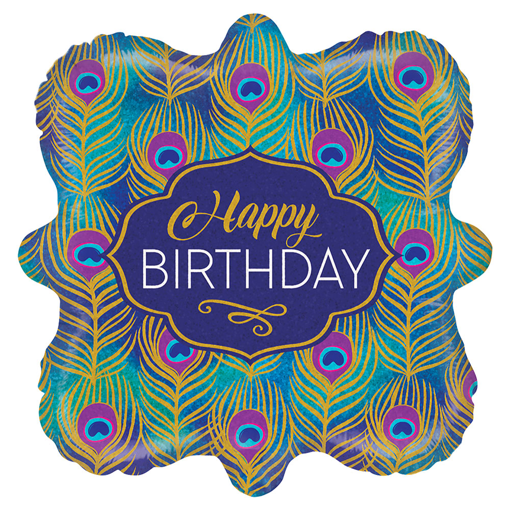 Det blir svårt att hitta en festligare födelsedags-ballong än denna! En elegant happy birthday ballong med mönster av påfågelfjädrar och holografiskt glitter som gör den till en perfekt födelsedag-dekoration. Den är enkel att dekorera med och passar till både barn och vuxna.