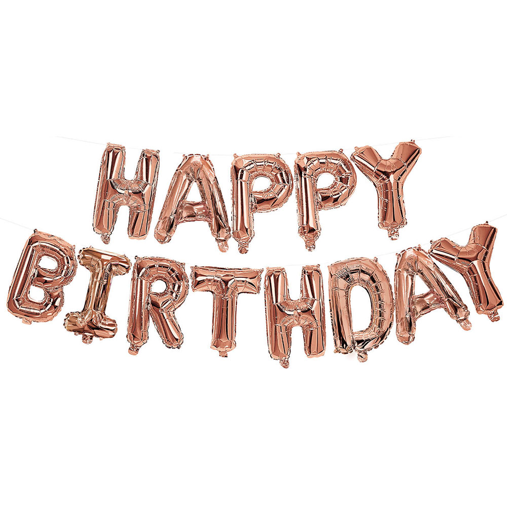 Happy Birthday Bokstavsballonger Roseguld omfattar 13 st roseguldiga bokstavsballonger som bildar texten "Happy Birthday". Folieballongerna är ca 34 cm höga och är försedda med öglor upptill för enkel upphängning. Det kommer med ett sugrör för att enkelt blås upp ballongerna med luft, det följer även med ett mindre vitt ballongsnöre.