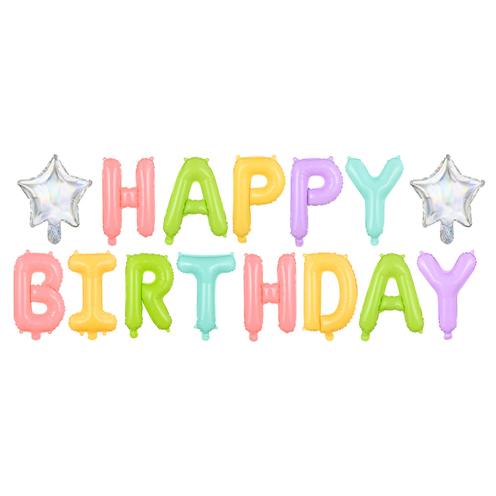 Happy Birthday Bokstavsballonger omfattar ett set om 15 stycken ballonger, två stjärnor i silver och bokstäver att stava "Happy Birthday" i flera färger. Ballongerna blir ca 35 cm höga och hela setet blir ca 4 m långt, men det beror förstås på hur nära man sätter ballongerna. Ballongerna fylls antingen med luft eller helium och har öglor både uppe och nere.