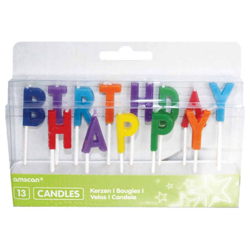Happy Birthday Bokstavsljus innehåller 13 stycken olika långa tårtljus i färgerna mörkblått, ljusblått, lila, orange, grönt, rött och gult. Tårtljusen bildar orden "Happy Birthday". Ljusen sitter på små vita pinnar som gör det enkelt att sätta ner dem i tårtan.