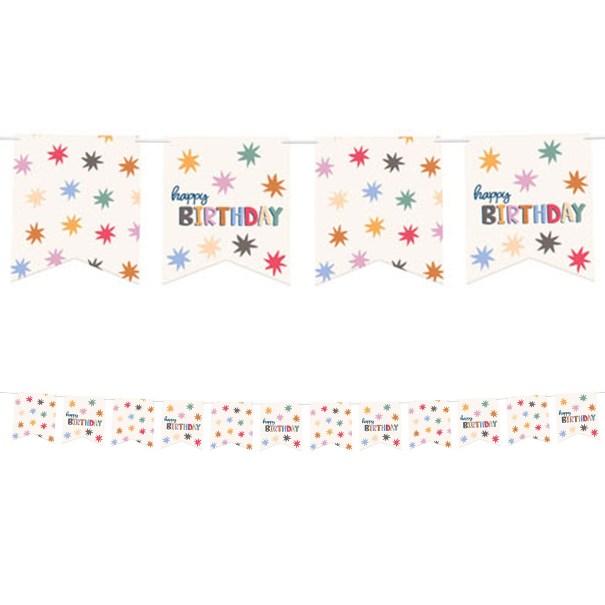 Happy Birthday Flaggirlang med Stjärnor omfattar en flaggirlang med sexton flaggor, dekorerade med texten "Happy Birthday" samt stjärnor i svart, blått, grönt, orange, rött, brunt och rosa.