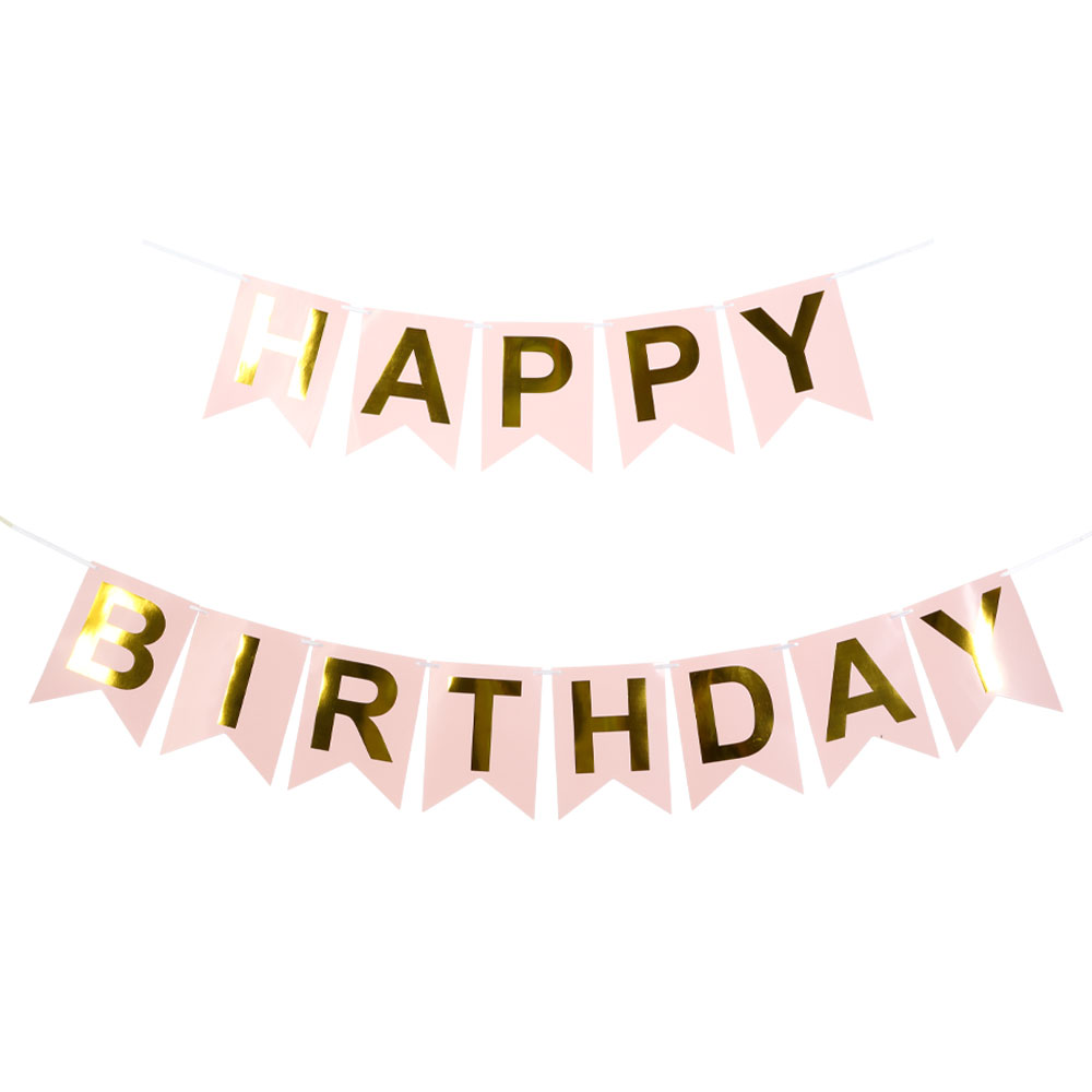 Happy Birthday Flaggirlang Rosa omfattar en 4 meter lång girlang med 13 st rosa pappflaggor med guldiga bokstäver som bildar texten "Happy Birthday". Flaggorna är ca 17 x 23 cm stora.