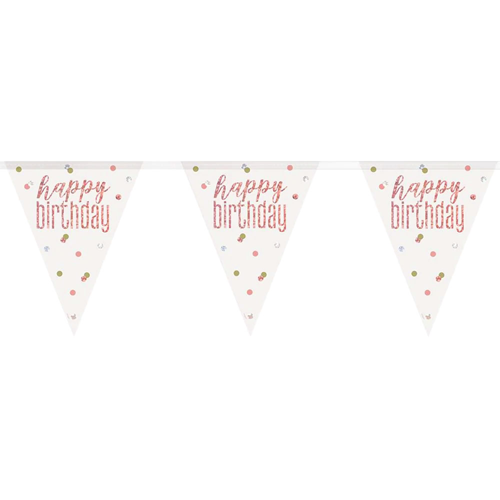 Happy Birthday Flaggirlang Vit & Roséguld omfattar en 2,74 meter lång girlang med stora flaggor i tunn plast. Flaggorna är vita med prickigt motiv i rosa, grönt och silver samt texten "Happy birthday" i roséguld med holografisk effekt. Flaggorna är ca 28 cm långa och 22 cm breda och har baksida i holografiskt silver. Hängs upp med transparent plastband.