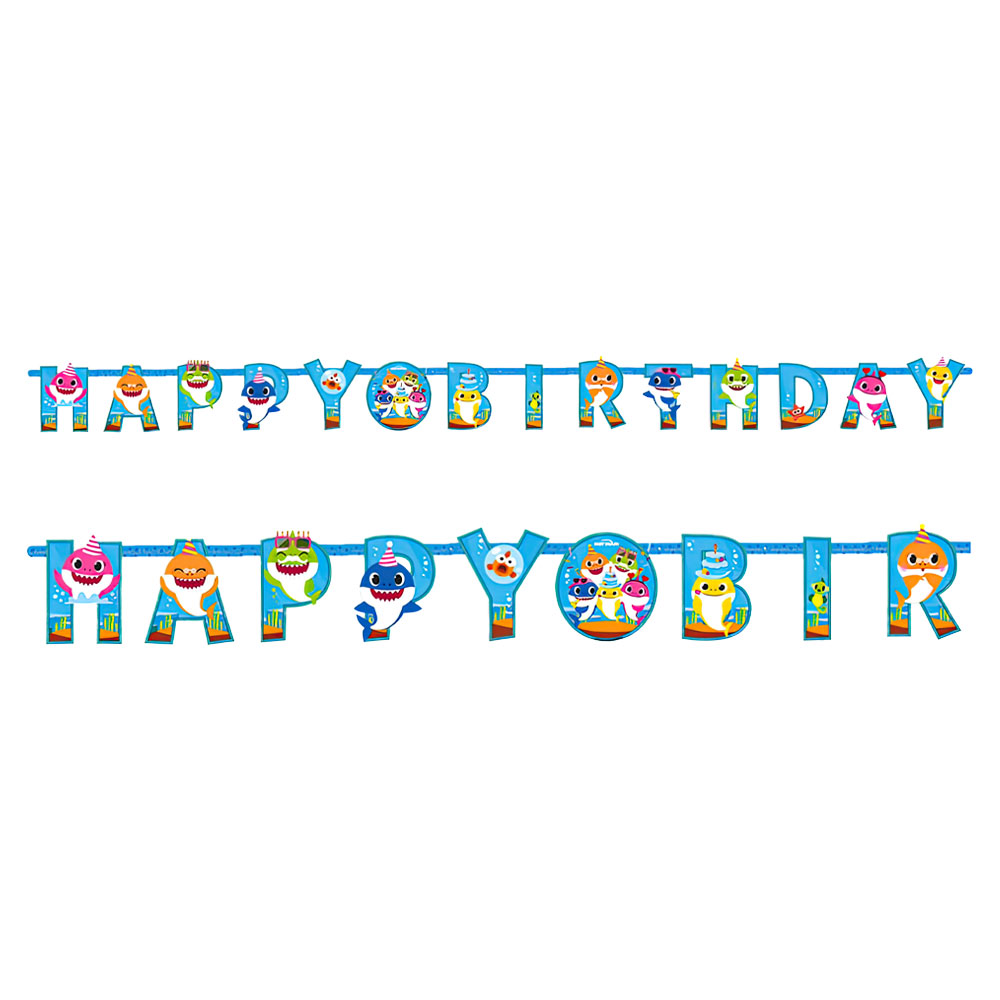 Happy Birthday Girlang Baby Shark Party omfattar en färgglad girlang med texten "Happy Birthday" som pryds av flera olika Baby Shark motiv. Girlangen är tillverkad av papp och är ca 12 cm hög samt 180 cm lång.