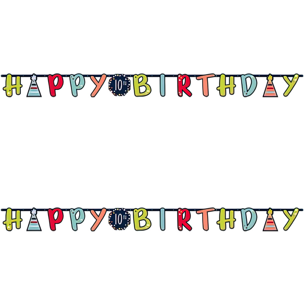 Happy Birthday Girlang Celebrate omfattar en mörkblå girlang med texten "Happy Birthday" i flera olika färger. Medföljer även siffror(0-9) och ändelser(st, nd, rd, th) att fästa på girlangens mitt. Girlangen är tillverkad av papp och är ca 25 cm hög samt 320 cm lång.