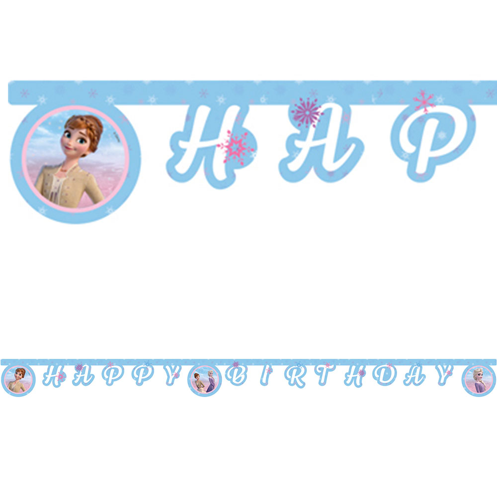 Happy Birthday Girlang Frost 2 Wind Spirit omfattar en ljusblå Frost girlang med texten "Happy Birthday" samt fina motiv av Anna och Elsa. Girlangen är i papp och är ca 15 cm hög samt 2 meter lång.