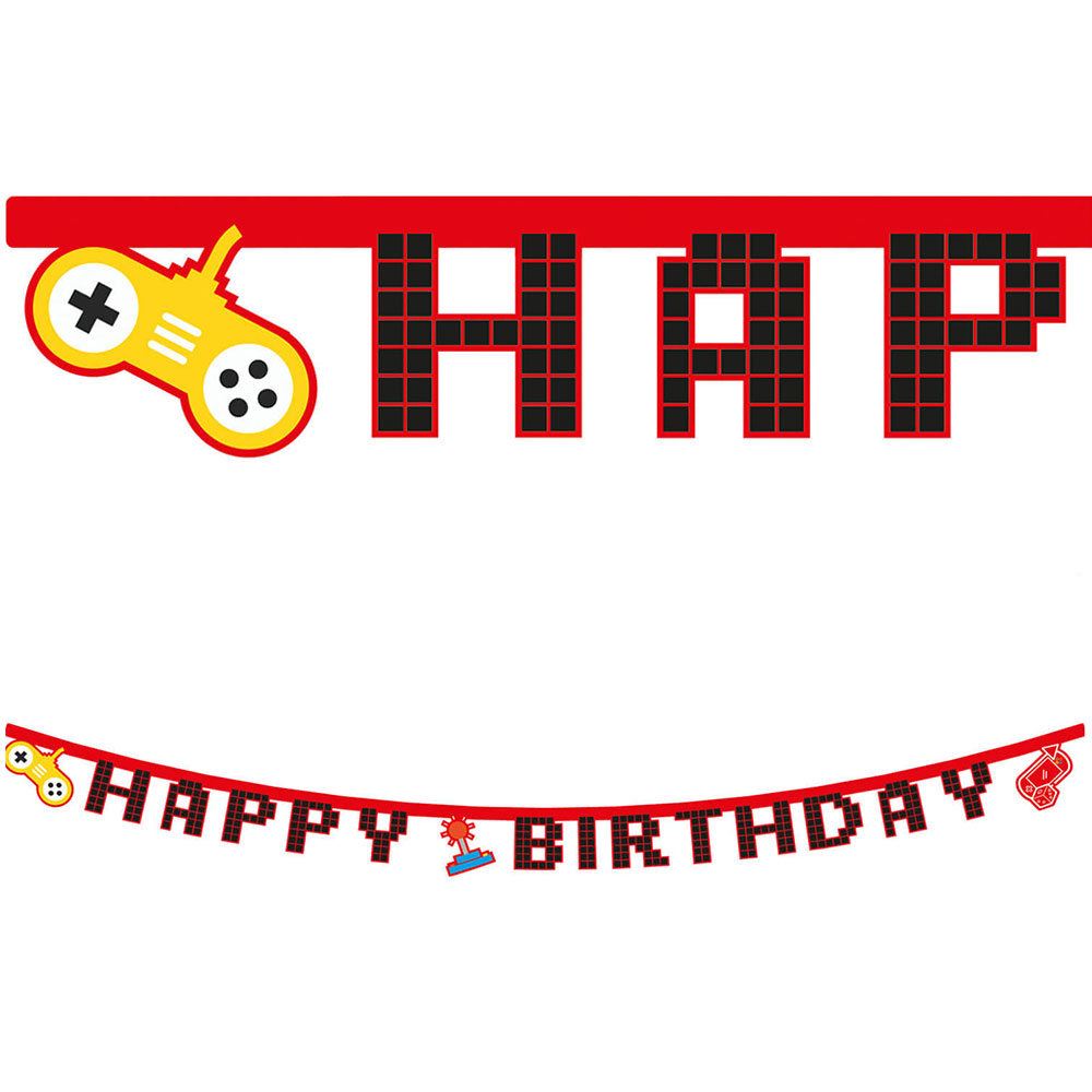 Happy Birthday Girlang Gaming Party omfattar en girlang med "Happy Birthday" text och gaming motiv. Girlangen är ca 15 cm hög samt 2 meter lång.