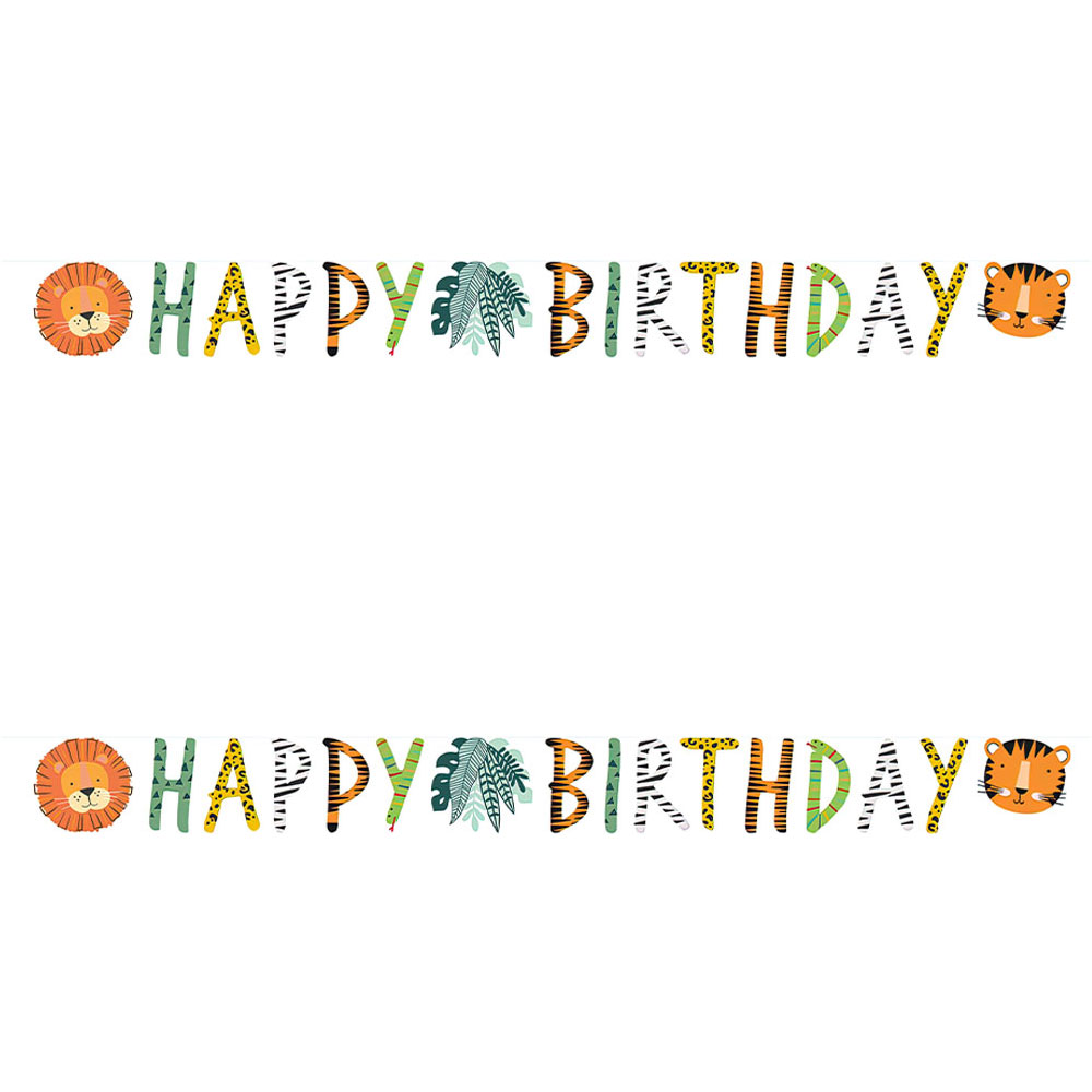 Happy Birthday Girlang Get Wild omfattar en färgglad girlang med texten "Happy Birthday" i olika djurmönster och med fina motiv av ett lejon, en tiger och djungelväxter. Girlangen är tillverkad av papp och är ca 15 cm hög samt 180 cm lång.