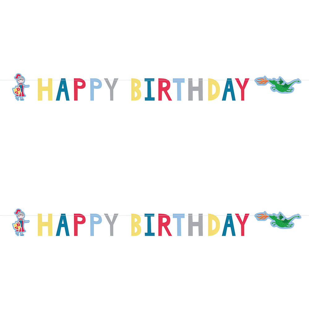 Happy Birthday Girlang Knight omfattar en dekorativ girlang i gult, rött, blått och grått med texten "Happy Birthday" samt fina motiv av en riddare och en drake. Girlangen är tillverkad av papp och är ca 15 cm hög samt 160 cm lång.