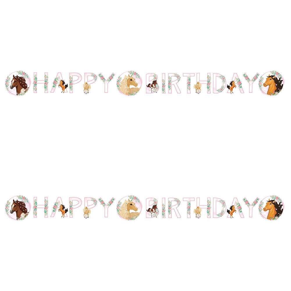 Fira födelsedagen bland massor av fina hästar! Denna fina happy birthday girlang med hästmotiv gör det möjligt att enkelt få till ett riktigt festligt kalas i hästtema. Superfin happy birthday dekoration som genast förvandlar hemmet, festlokalen eller till och med stallet till ett stämningsfullt hästkalas.