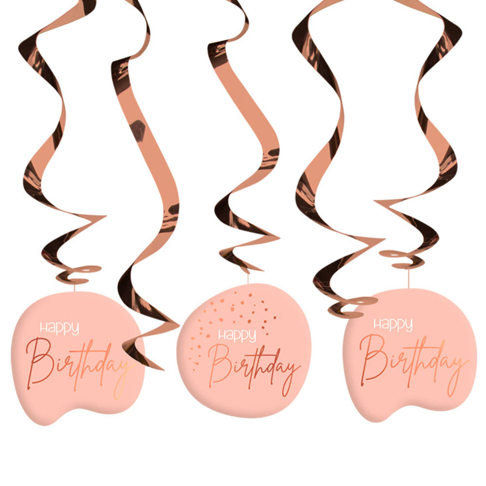 Happy Birthday Hängande Dekorationer Ljusrosa innehåller 5 stycken roseguldiga swirls, varav tre av dem har ljusrosa hängande dekorationer med "Happy Birthday" text i vitt och roseguld. Swirlsen har även praktiska upphängningsöglor i plast.