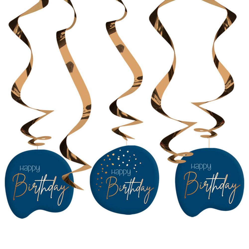 Happy Birthday Hängande Dekorationer Mörkblå omfattar 5 stycken guldiga swirls, varav tre av dem har mörkblåa hängande dekorationer med texten "Happy Birthday" i ljusblått och guld. Swirls dekorationerna har upphängningsöglor av plast.