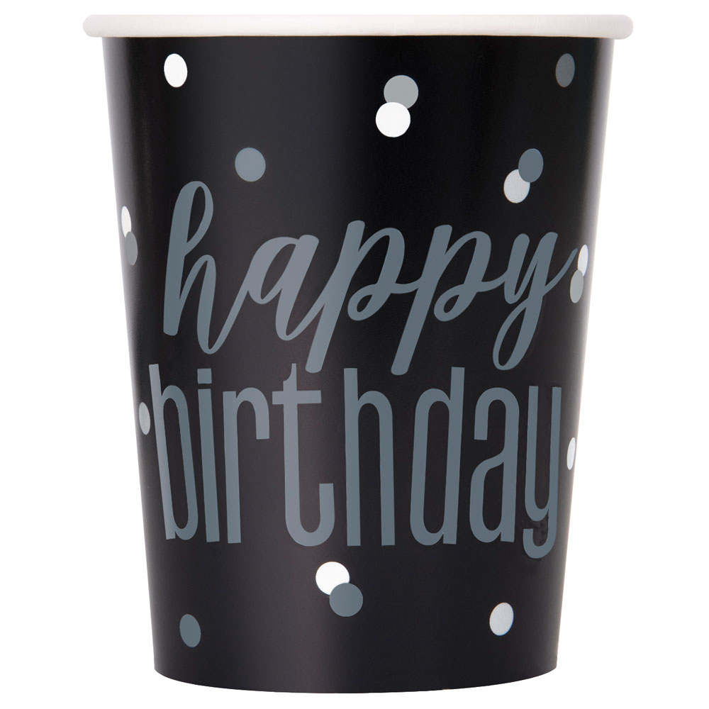 Happy Birthday Muggar Svart & Grått innehåller svarta engångsmuggar med ljusgrå "Happy Birthday" text och vita, gråa och ljusgråa prickar.