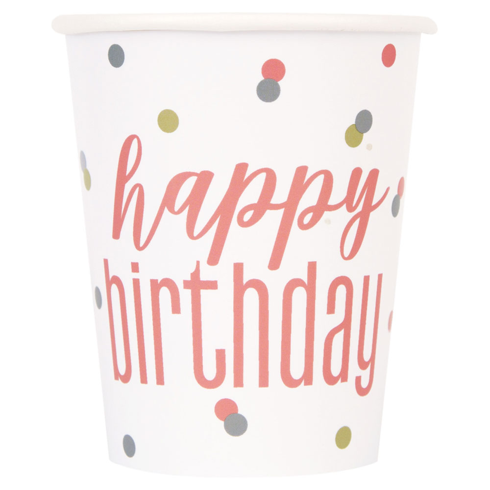 Happy Birthday Muggar Vit & Rosa omfattar vita muggar i papp med ljusrosa "Happy birthday" text och prickar i grått, grönt och rosa. Muggarna är ca 9 cm höga och säljs i 8-pack.