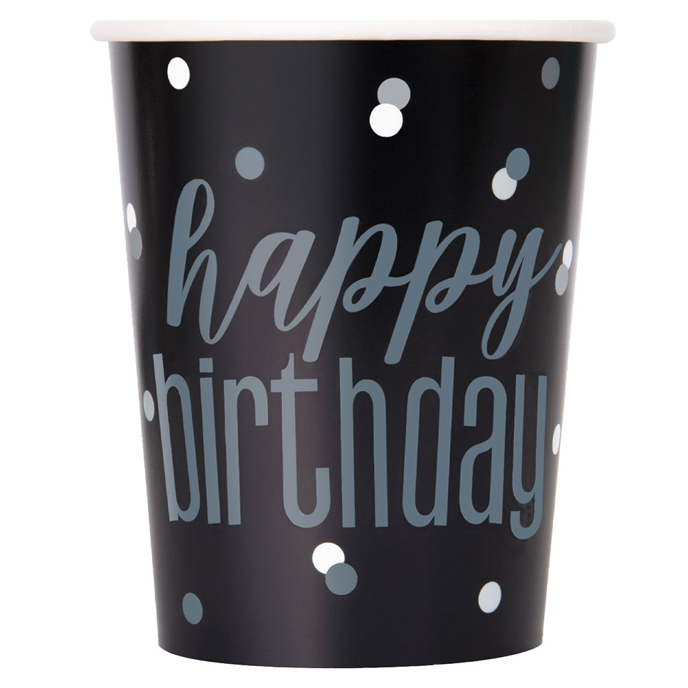 Happy Birthday Pappersmuggar Svarta omfattar 8 st engångsmuggar i svart med text "Happy Birthday" i grått och med vita och grå prickar. Muggarna är tillverkade av papp, rymmer ca 27 cl och är ca 9 cm höga.
