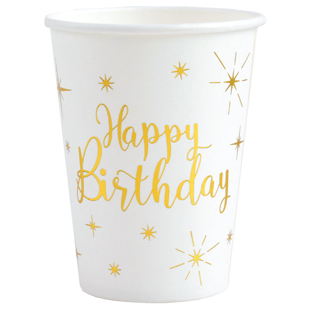 Happy Birthday Pappmuggar Sparkle omfattar ett 10-pack vita engångsmuggar med guldig "Happy Birthday" text samt guldiga motiv av stjärnor och serpentiner. Muggarna är tillverkade av papp och är ca 9,5 cm höga samt 7,5 cm breda.