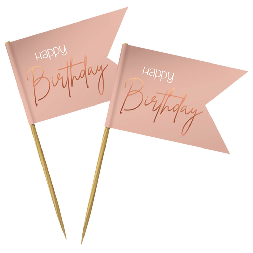 Happy Birthday Party Picks Ljusrosa innehåller party picks med ljusrosa små flaggor med texten "Happy Birthday" i roséguld.