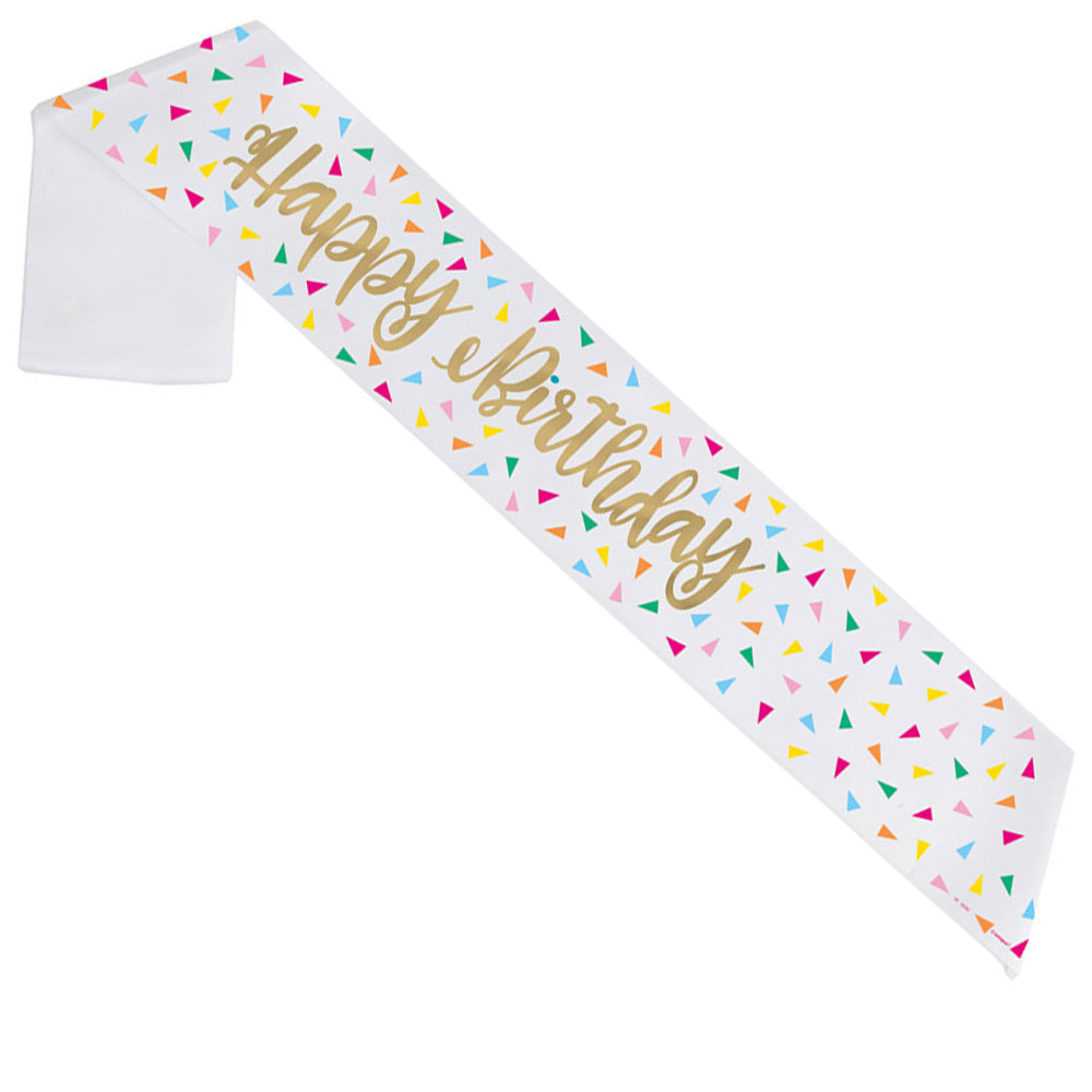 Happy Birthday Sash är ett festligt vitt ordensband med färgglada prickar på sig samt texten "Happy Birthday".