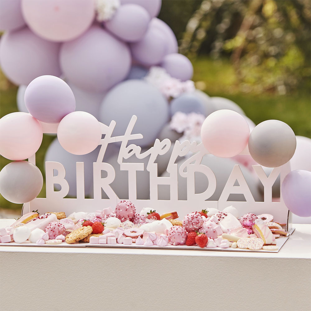 Happy Birthday Serveringsfat omfattar ett vitt engångsserveringsfat med uppstickande "Happy Birthday" text. Serveringsfatet är tillverkat av återvinningsbar papp och är ca 56 cm hög samt 63 cm bred. Fatet har även små hål att fästa exempelvis miniballonger i.
