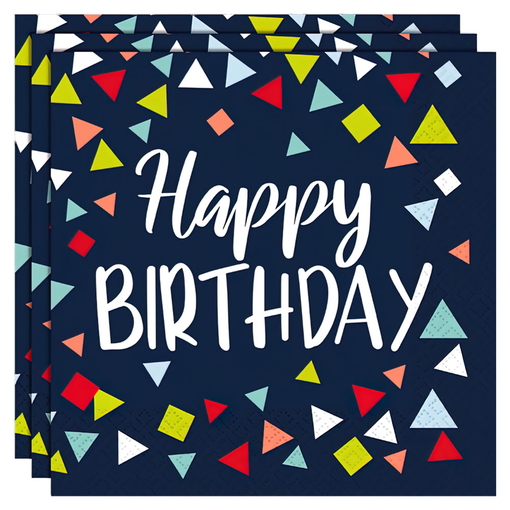 Happy Birthday Servetter Celebrate omfattar ett 16-pack pappersservetter i mörkblått med färgglatt konfettimotiv samt vit "Happy Birthday" text. Servetterna har två lager och mäter 33 x 33 cm utvikta.