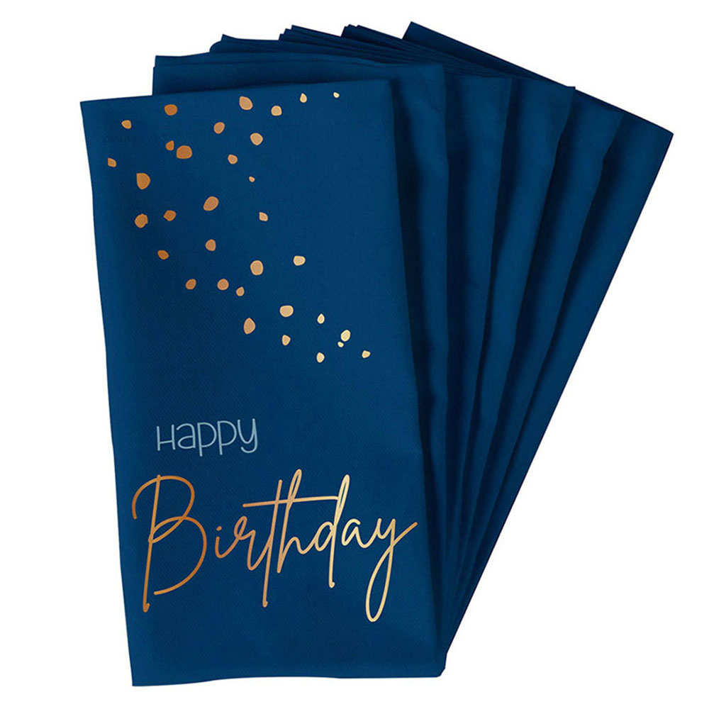 Happy Birthday Servetter Mörkblå omfattar ett 10-pack mörkblåa servetter av papp med guldiga prickar samt texten "Happy Birthday" i ljusblått och guld. Servetterna är återvinningsbara, har tre lagar och mäter ca 8 x 16,5 cm hopvikta.