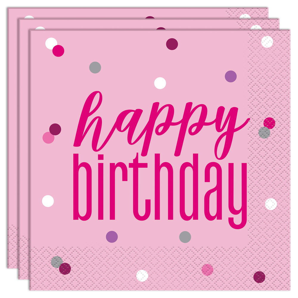 Happy Birthday Servetter Rosa omfattar 16 stycken pappersservetter i ljusrosa med mörkrosa "Happy birthday" motiv och prickar i vitt, grått, rosa och lila. Servetterna har två lager och är ca 33 x 33 cm utvikta.