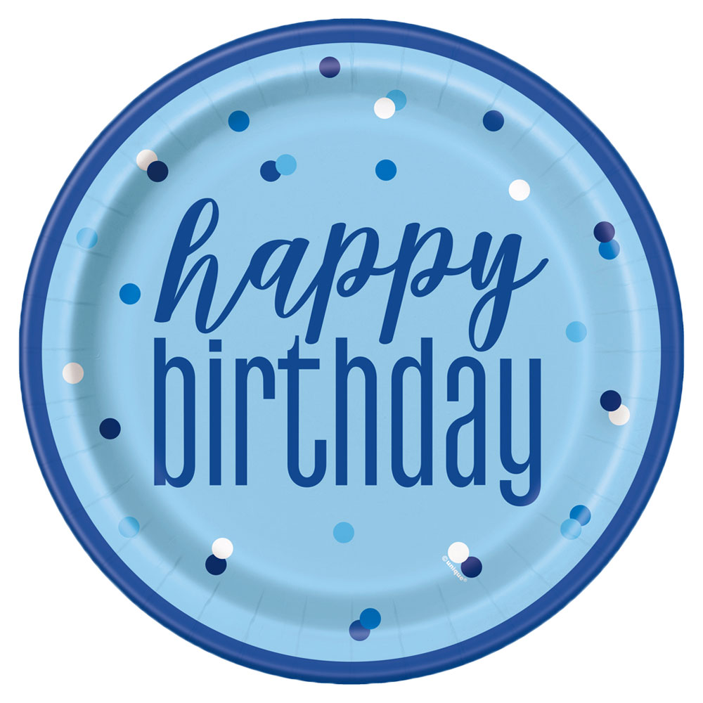 Happy Birthday Tallrikar Blå omfattar åtta stycken ljusblå engångstallrikar med "Happy birthday" text och kant i blått med prickar i vitt och blått. Tallrikarna är tillverkade i papp och är ca 22,5 cm stora.