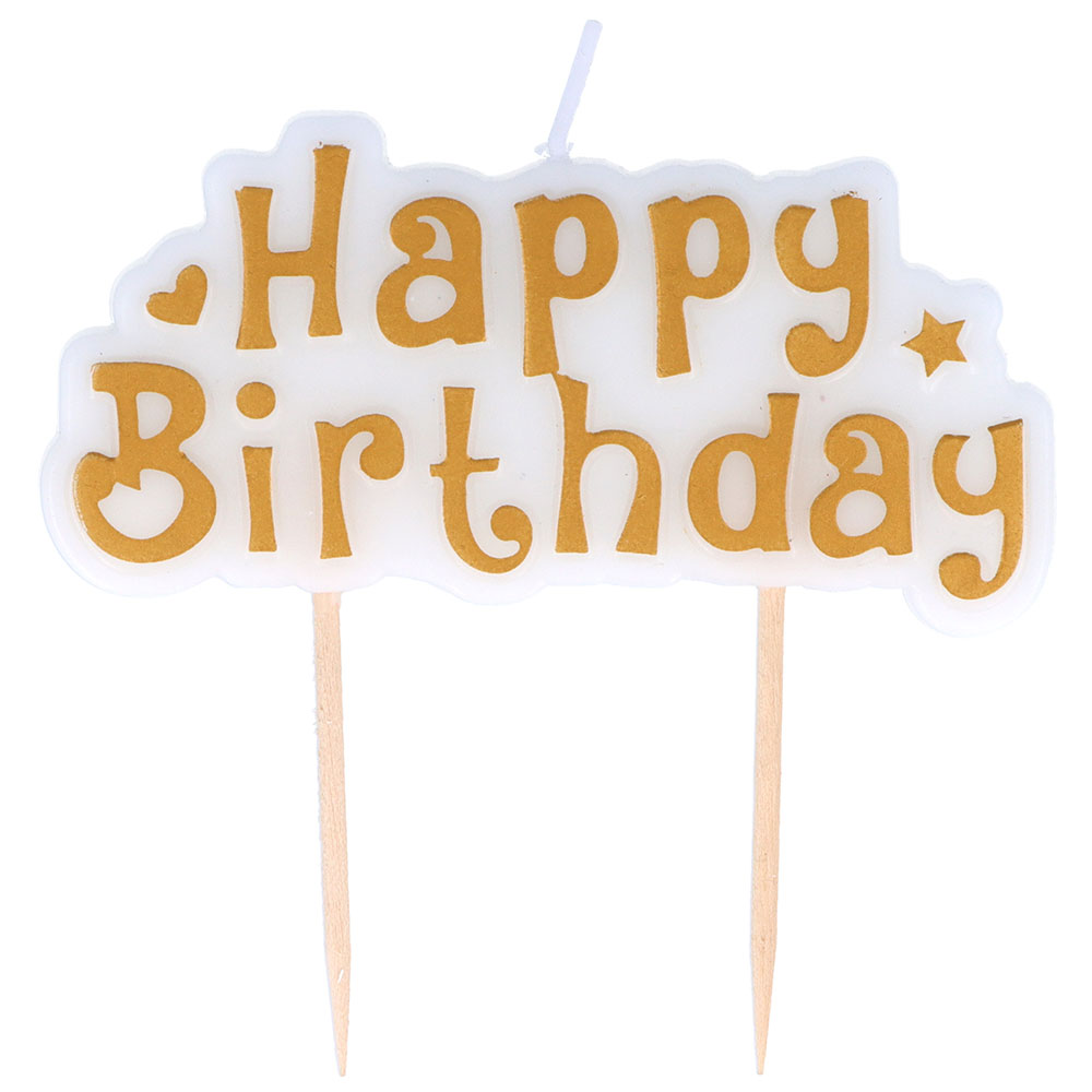 Happy Birthday Tårtljus Guldfärgad omfattar ett tårtljus med texten 'happy birthday' skrivet i guld och den har även en guldig stjärna samt hjärta. Den har även två träpinnar längst ner som gör det enkelt att sätta ljuset på plats i tårtan.