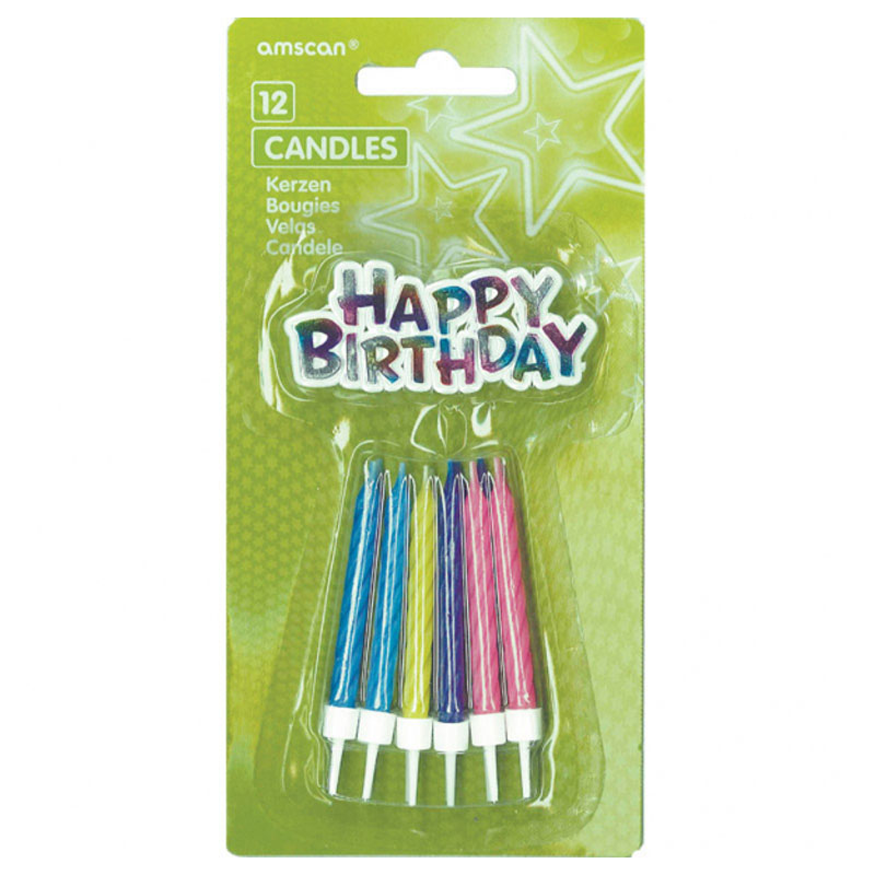 Happy Birthday Tårtljus och Tårtdekoration innehåller 12 stycken spiralformade tårtljus i ljusblått, mörkblått, gult och rosa samt en vit dekoration i form av texten "Happy Birthday" i skimrande silver, guld, blått och rosa. Dekorationen är tillverkad plast.