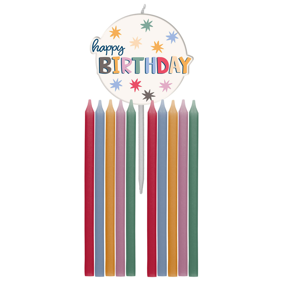 Happy Birthday Tårtljus Stjärnor 11-pack består av tio tårtljus i rött, grönt, lila, blått och rosa samt ett runt tårtljus i vitt med vit plastpinne, stjärnor och texten "Happy Birthday".