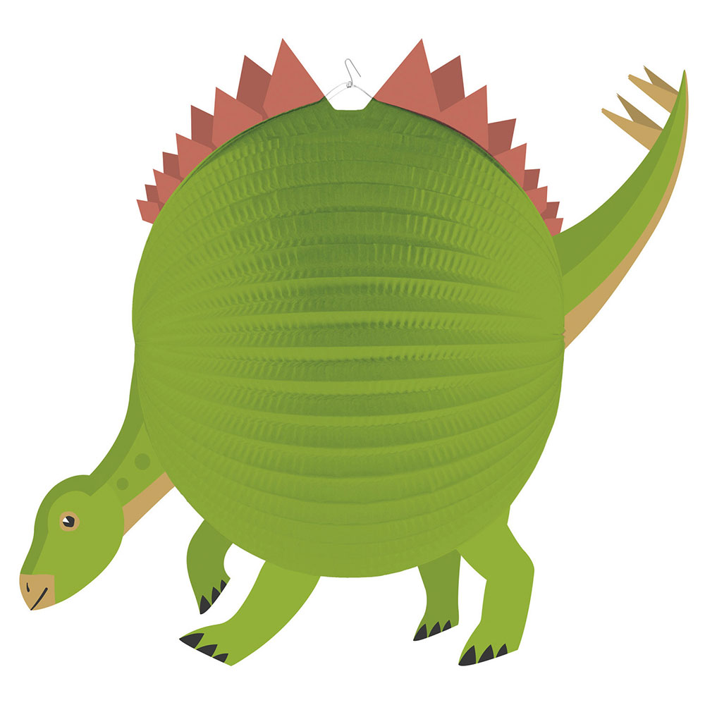 Happy Dinosaur Papperslykta omfattar en rund papperslykta i form av en grön stegosaurus. Lyktan har en ljushållare i botten för ett litet stearinljus och blir ca 35 cm bred.