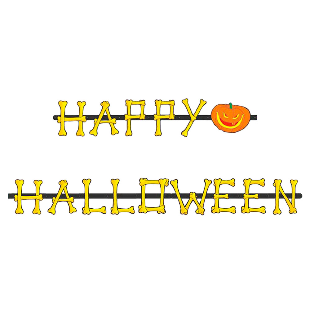 Happy Halloween Girlang Pumpa omfattar en ca 2 meter lång girlang med texten "Happy Halloween" och ett motiv av en halloween pumpa. Tillverkad av papp.