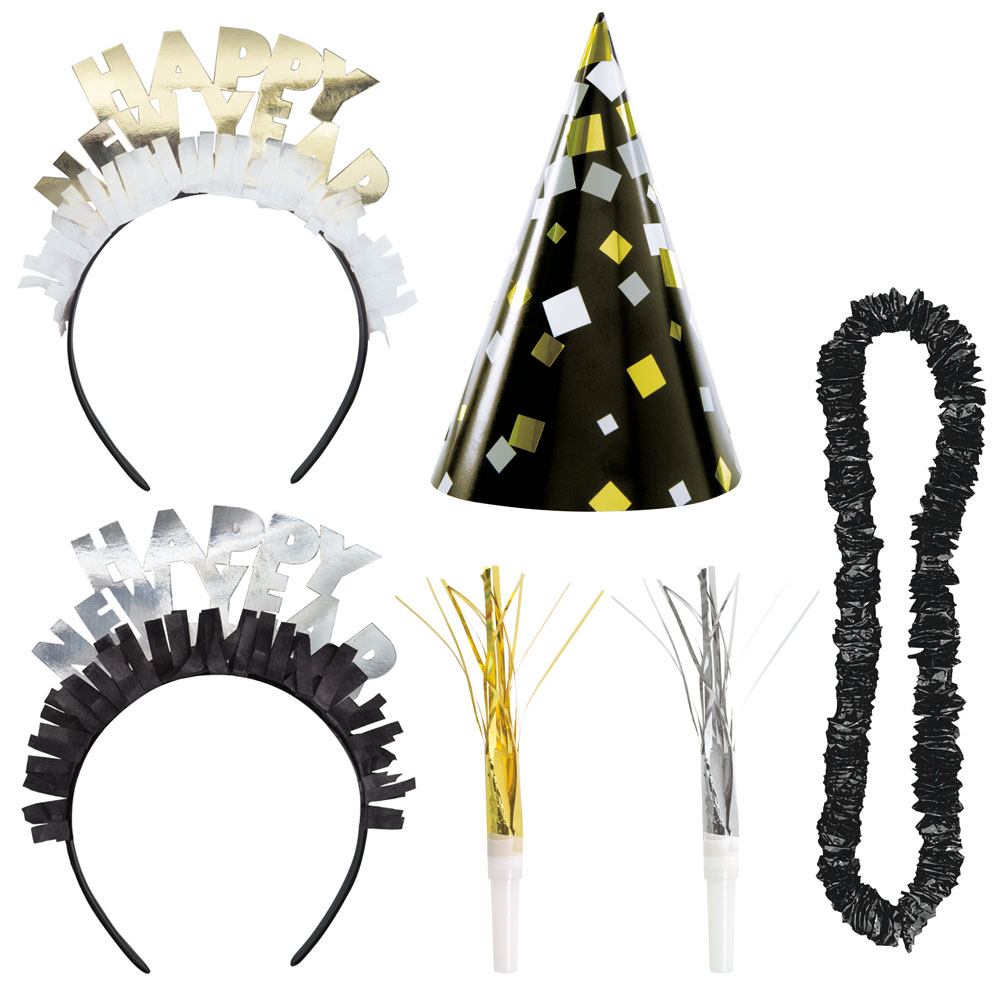 Happy New Year Celebration Partykit omfattar ett nyårsfest-tillbehörskit för upp till 8 personer. Tillbehörskitet består av 4 olika festtillbehör i svart, silver och guld.