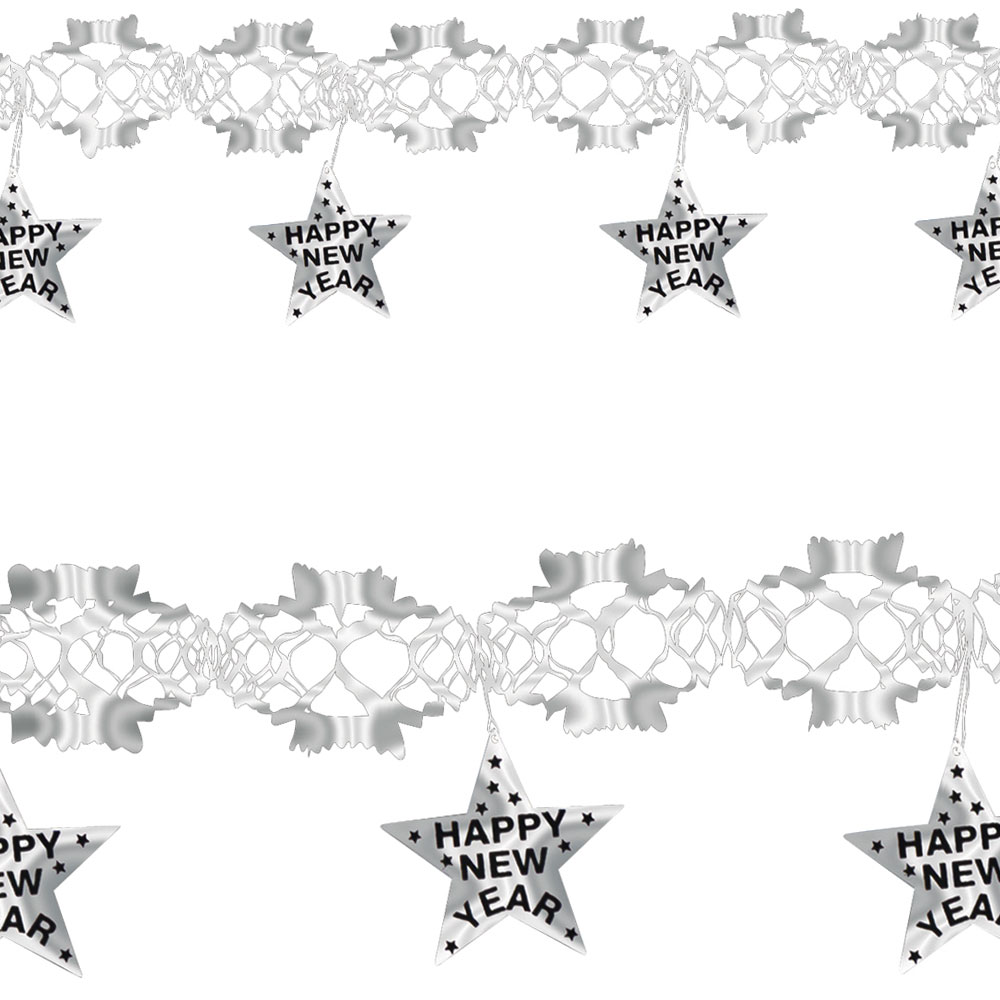 Happy New Year Girlang Holo Silver omfattar en holografiskt skimrande girlang i silver med fyra stycken hängande stjärnor med "Happy New Year" texter. Girlangen är i papp och mäter ca 3 meter lång.