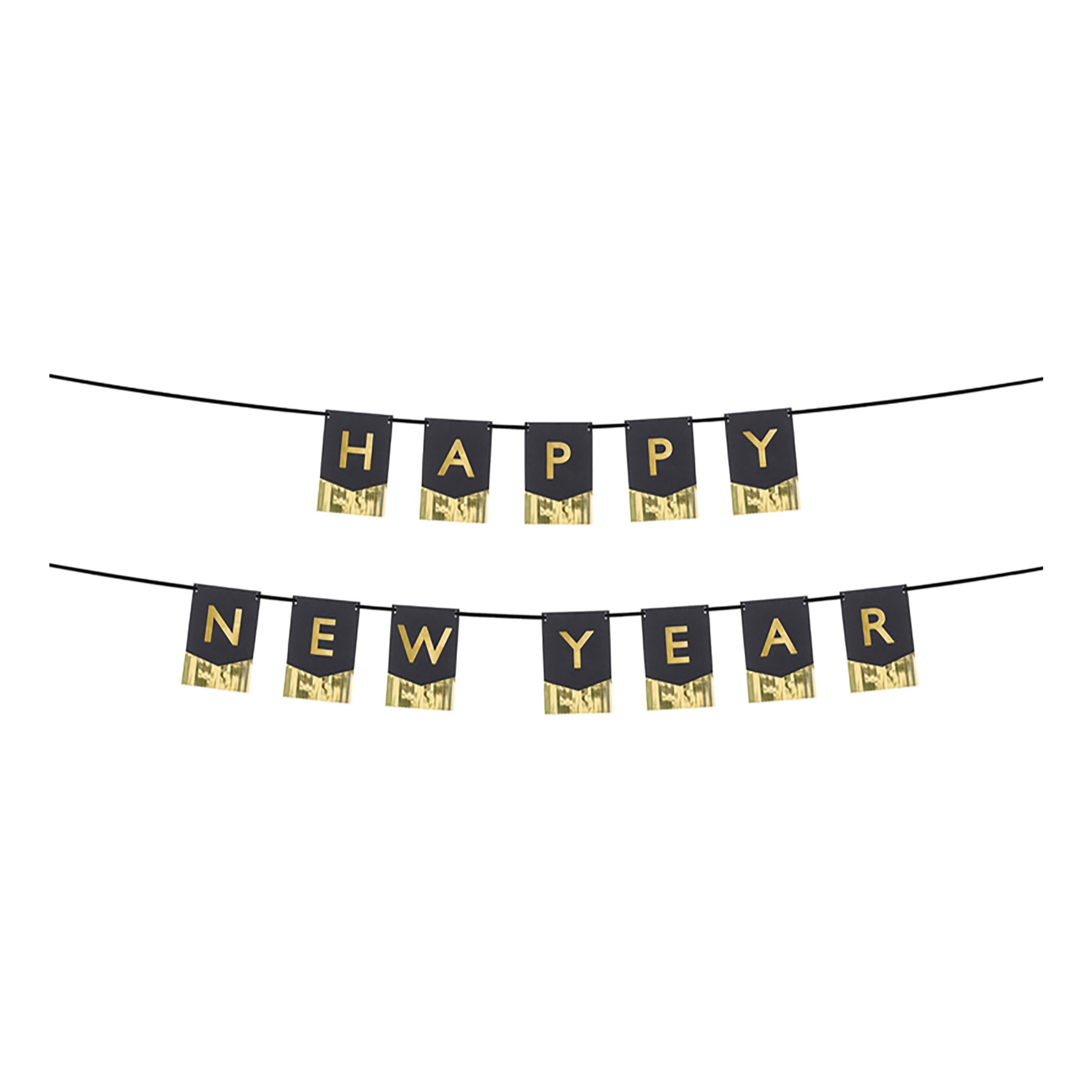 Happy New Year Girlang Svart/Guld är en svart och guldig girlang i två delar som kommer med texten "Happy new Year". Girlangen hängs enkelt upp med hjälp av en bit tejp eller liknande.