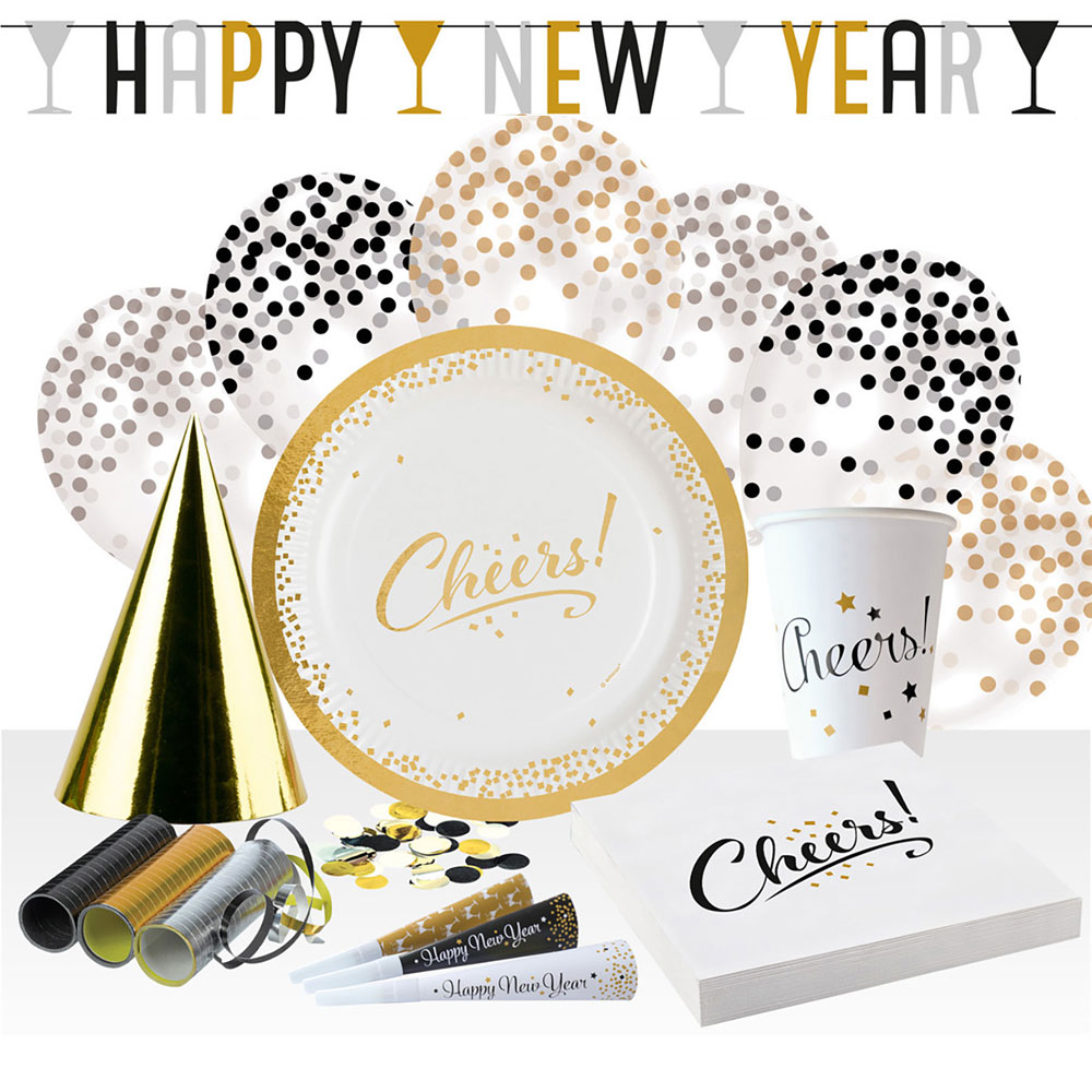 Happy New Year Nyårsfest Kit innehåller 9 stycken olika nyårs dekorationer och tillbehör i vitt, guld, silver och svart. Dekorationerna och tillbehören har motiv av skålande glas, stjärnor, konfetti samt texterna "Cheers!" och "Happy New Year".