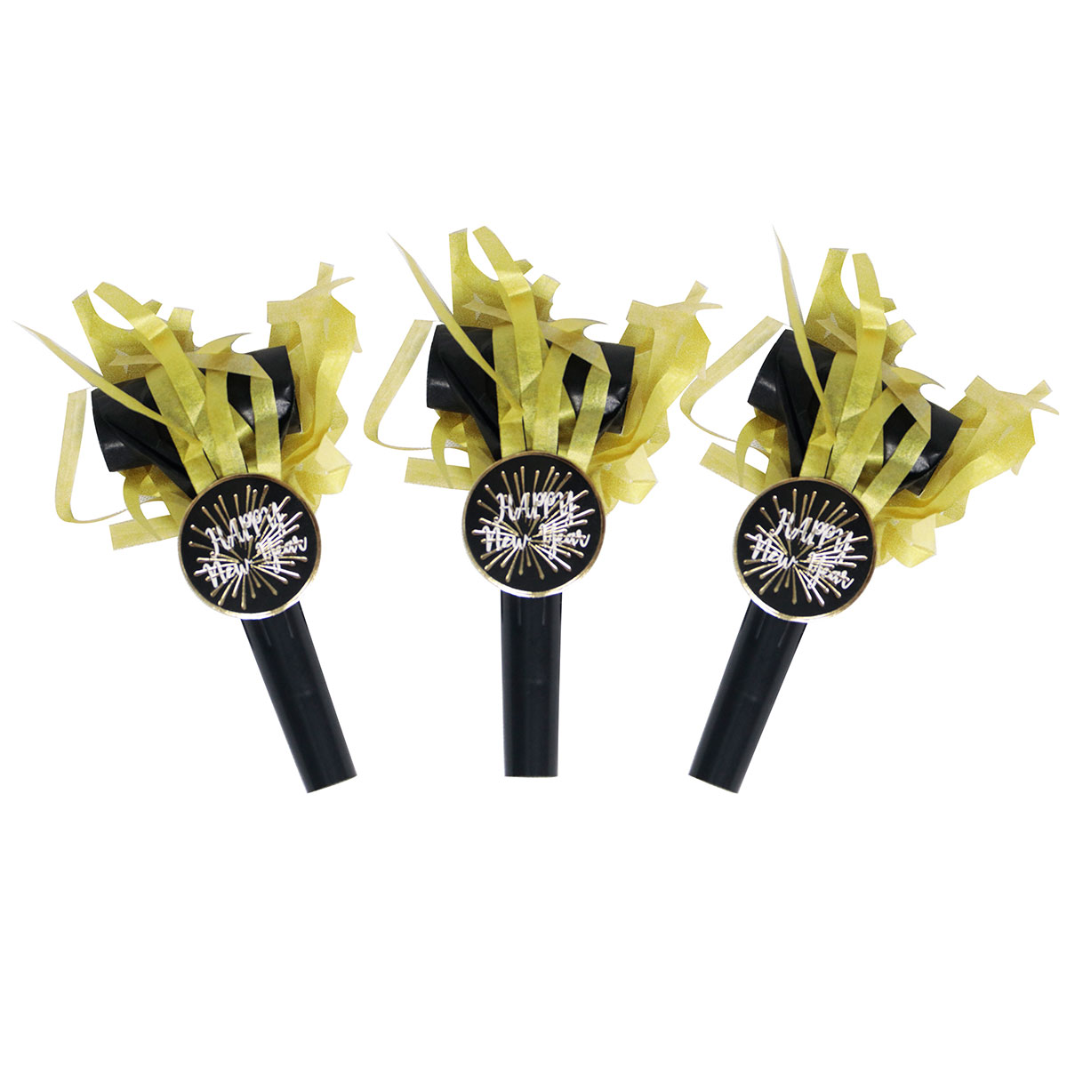 Happy New Year Ormblåsor 4-pack består av fyra svarta ormblåsor med guldfolie fransar och texten "Happy New Year".