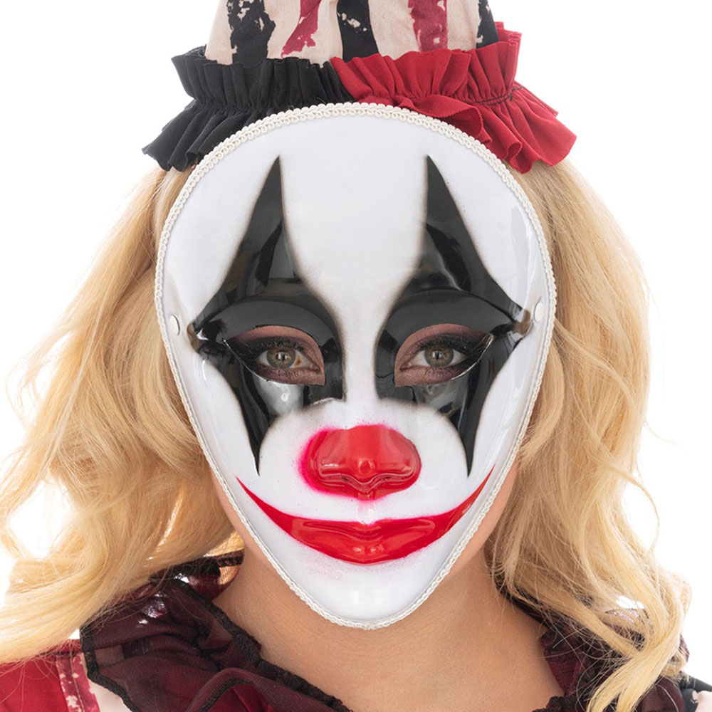 Hård Clownmask omfattar en vit clownmask med svart färg runt ögonen, röda läppar och matchad näsa samt ett vitt band med mönster längs hela masken. Masken har hål för ögon och näsa och hålls på plats med ett genomskinligt band av hårdplast.
