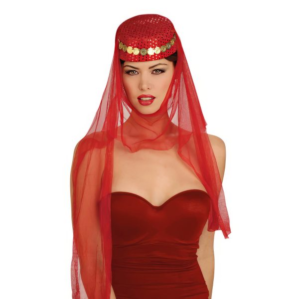 Röd haremshatt med guldiga berlocker och röd slöja. Hatten är i One size-vuxenstorlek.