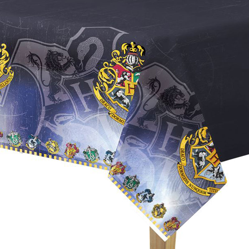 Harry Potter Duk innefattar en stor plast duk med Hogwarts skolvapensköld och de olika elevhemmens vapensköldar.