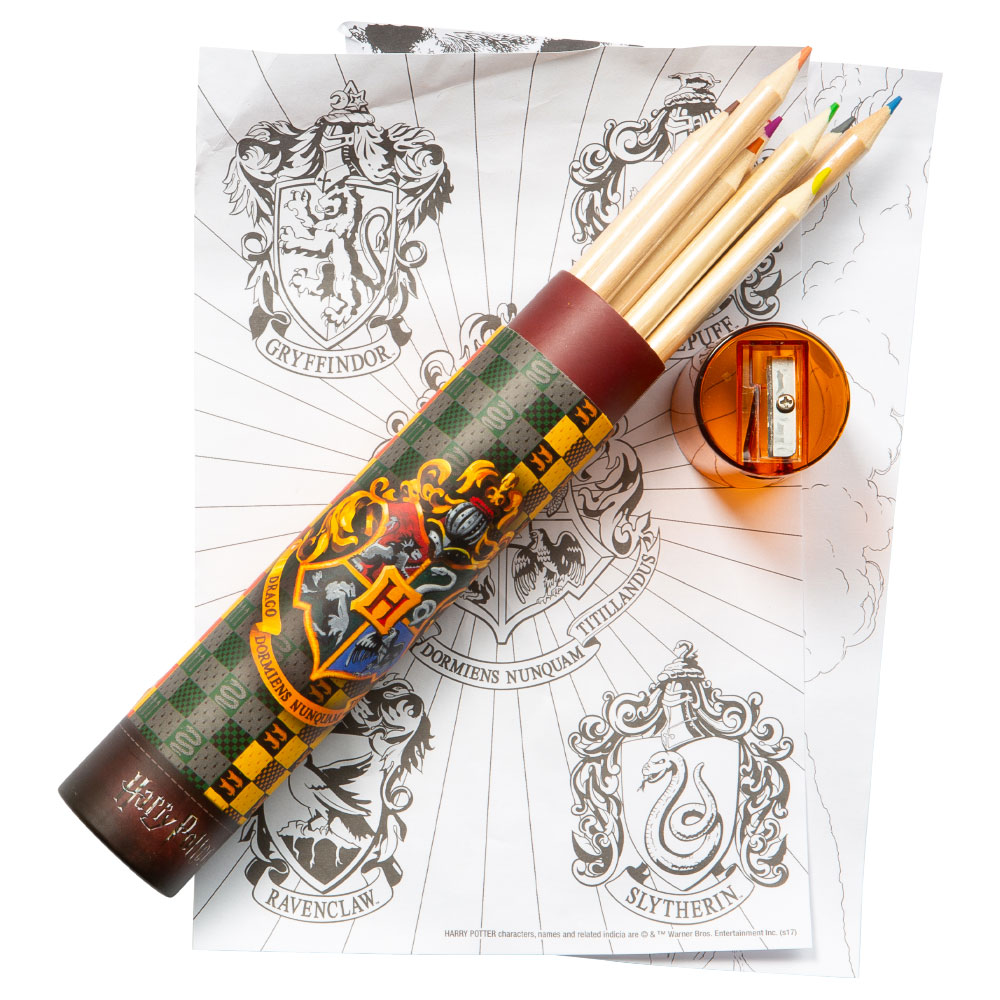 Ett snyggt set med pennor är alltid en praktisk och uppskattad present att ge bort och detta set med Harry Potter tema passar bra till Harry Potter-fanet i ditt liv. Med 12 färgpennor i en praktisk och snygg tub och en pennvässare i locket kommer det här packet att fylla alla färgläggningsbehov som ett Harry Potter fan kommer ha.