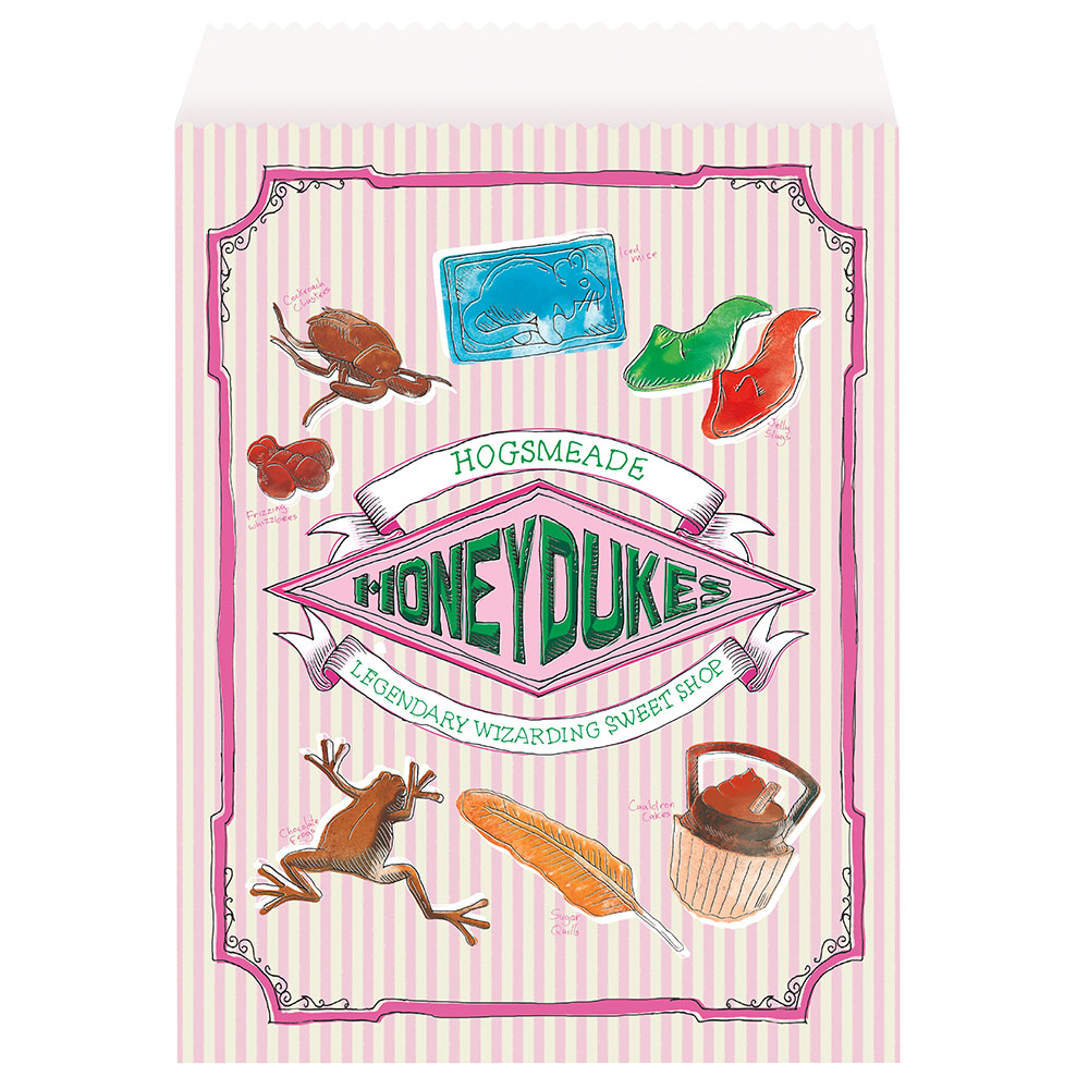 Harry Potter Kalaspåsar Honeydukes omfattar 8 stycken presentpåsar med Harry Potter motiv. Påsarna är färgade i randigt rosa/vitt mönster med motiv av Honeydukes logotyp samt deras godis och tillverkade i papp. Påsarna försluts med en grön klisterlapp. Påsarna är ca 24,5 höga och 15 cm breda.
